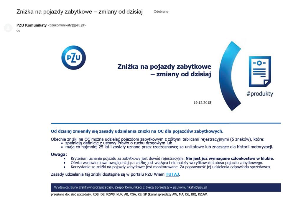 Skąd: warszawa Od: 2011-10-11 Postów: 643 | pzu rozsyła taką informację : Szanowni Państwo, Biuro Produktów Masowych PZU SA informuje, że z dniem 19.12.2018 r. będą obowiązywać zmienione zasady zniżki na obowiązkowe ubezpieczenie OC dla posiadaczy pojazdów zabytkowych. Posiadacz pojazdu będzie mógł otrzymać zniżkę bez względu na przynależność do klubu. Zniżka będzie przysługiwała na pojazd z tzw. "żółtymi tablicami rejestracyjnymi" (z pięcioma znakami) oraz spełniający jeden z warunków definiujących pojazdy historyczne w Ustawie z dnia 22 maja 2014 r. o ubezpieczeniach obowiązkowych, Ubezpieczeniowym Funduszu Gwarancyjnym i Polskim Biurze Ubezpieczycieli Komunikacyjnych, czyli: 1. na pojazd zabytkowy w rozumieniu przepisów ustawy Prawo o ruchu drogowym; 2. na pojazd mającym co najmniej 25 lat i uznany przez uprawnionego rzeczoznawcę samochodowego za pojazd unikatowy lub mający szczególne znaczenie dla udokumentowania historii motoryzacji. Wysokość zniżki nie ulegnie zmianie. Szczegółowe zasady udzielania zniżki będą dostępne u sprzedawców i na infolinii PZU. |